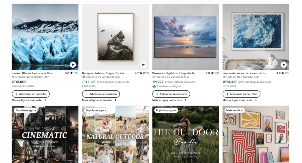 Além dos sites de acervo, você pode explorar outros locais para vender suas fotos, como criar produtos personalizados com suas imagens. Sites como Etsy permitem que você venda suas fotos como impressões, pôsteres, camisetas e muito mais, aumentando seus fluxos de receita.